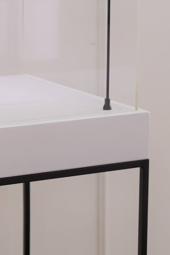 The Grace Plinth is a perfect addition to our existing jewellery display collection. Grace is a single lockable unit with a sliding drawer that enables you to access and store your display items carefully and safely. Each plinth has its own built in lighting that is powered by individual battery packs. The battery will provide power for up to 16 hours and is easily connected and disconnected from the unit (all concealed within the sliding drawer). The simple structure is formed from an elegant metal frame with a wooden top that supports the perspex case and drawer system.