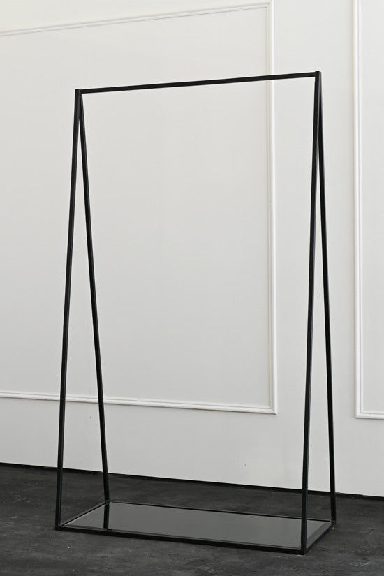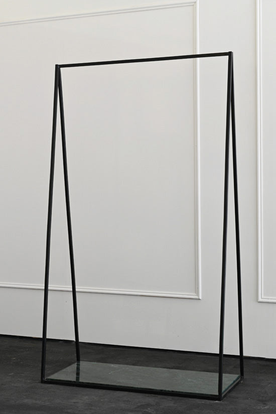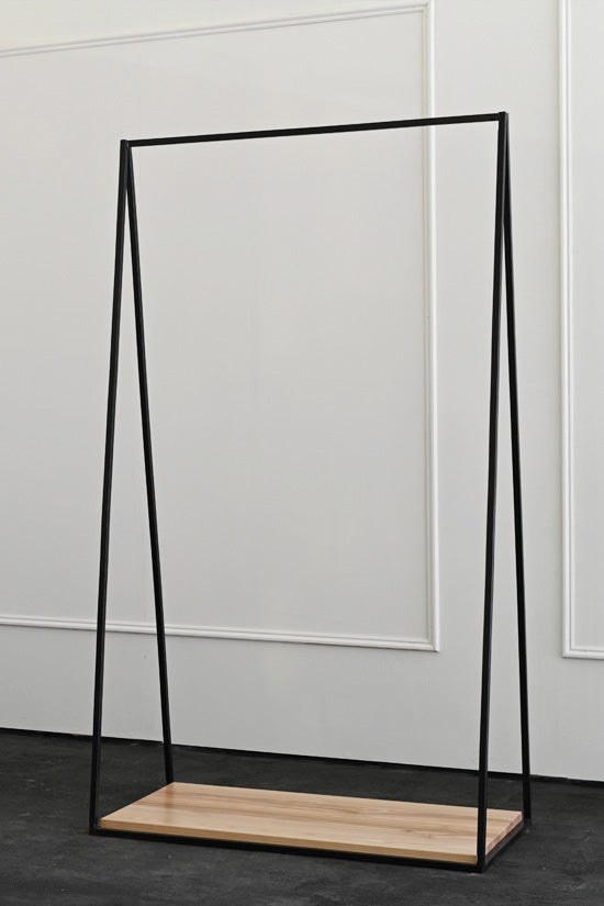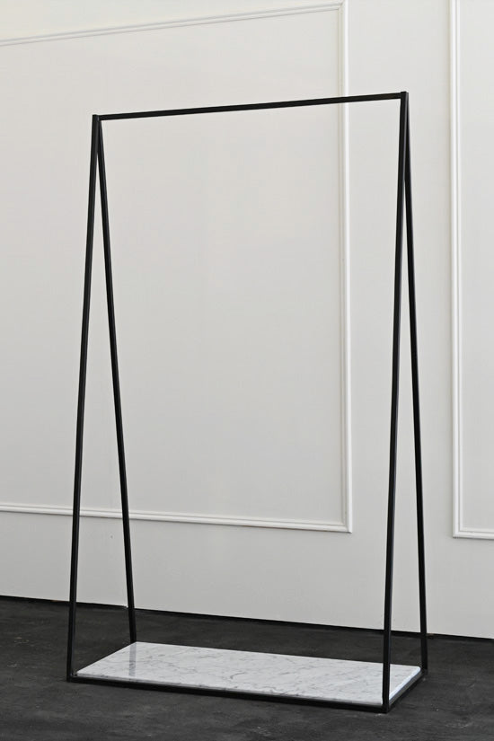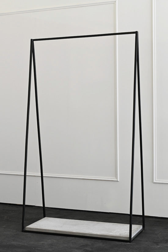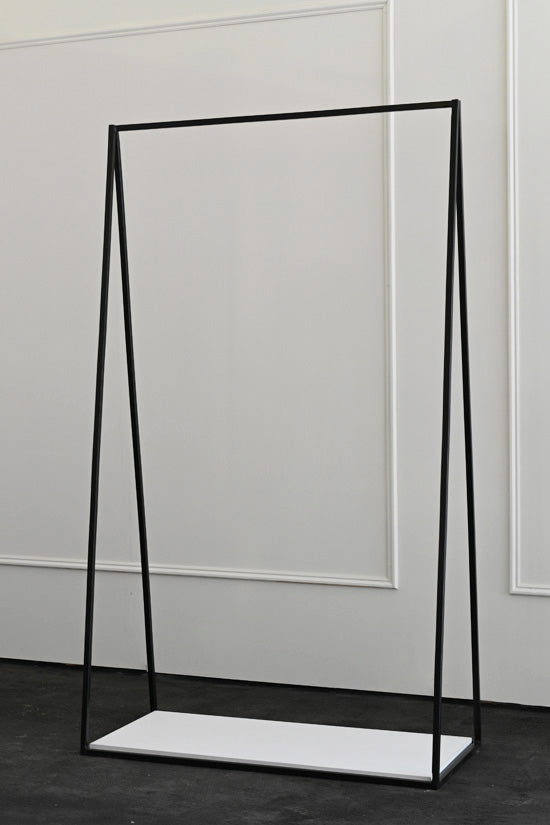 As an extension of our most popular plinth collection, we have introduced the metal frame clothing rails that mimic the design and structure of our metal frame plinths. The simple triangular design of these rails make a perfect hanging platform, providing both hanging space for clothes and a lower level display surface for shoes or accessories. The metal frames are made from 16mm steel and powder coated for a durable finish . At the bottom of the frame there is an interchangeable platform that allows for various options, from wood to marble.