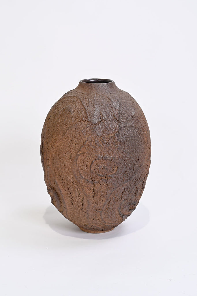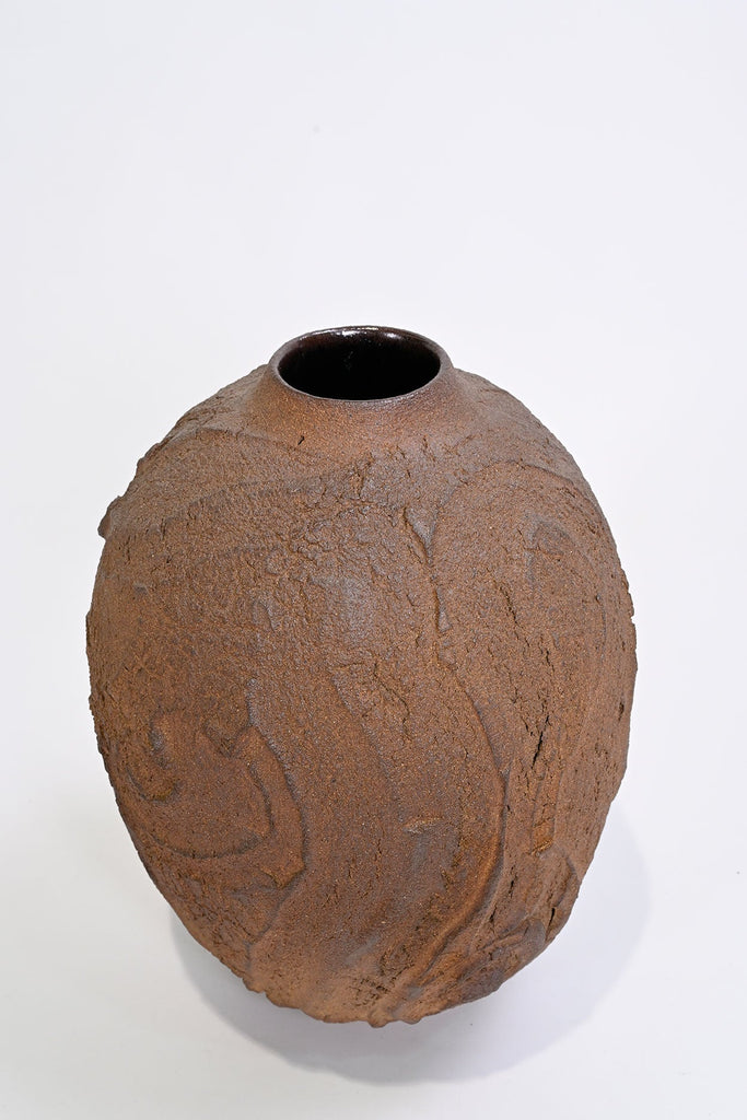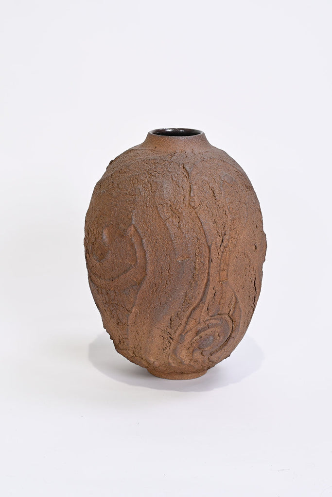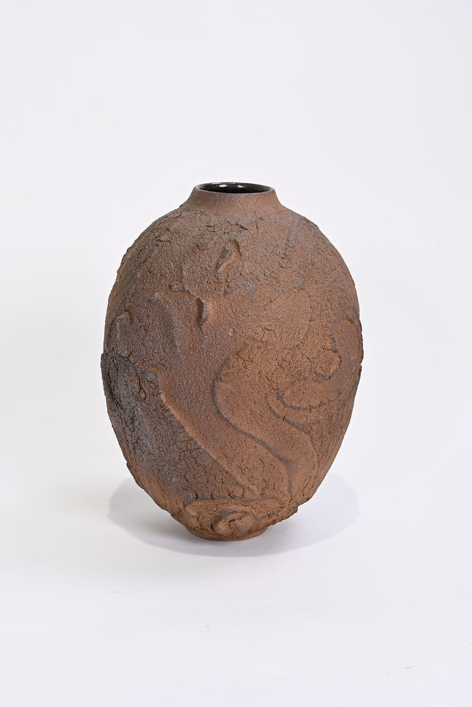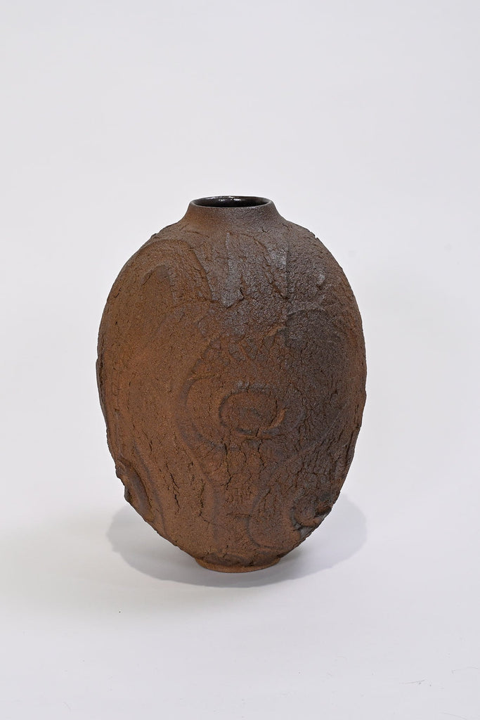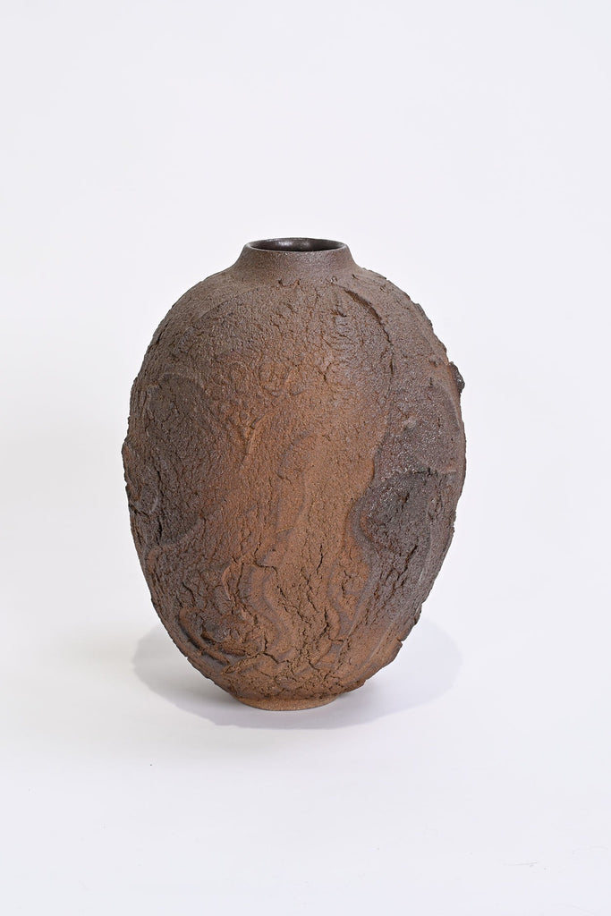 The textured surface in the Erosion series is left unglazed and takes on colour and markings during its firing in a charcoal filled saggar box within the wood kiln (also known as tanka firing). The glaze will develop bright ‘rust’ spots if exposed to moisture, this is a harmless and natural process and can be removed, if preferred, by wiping with a damp cloth.