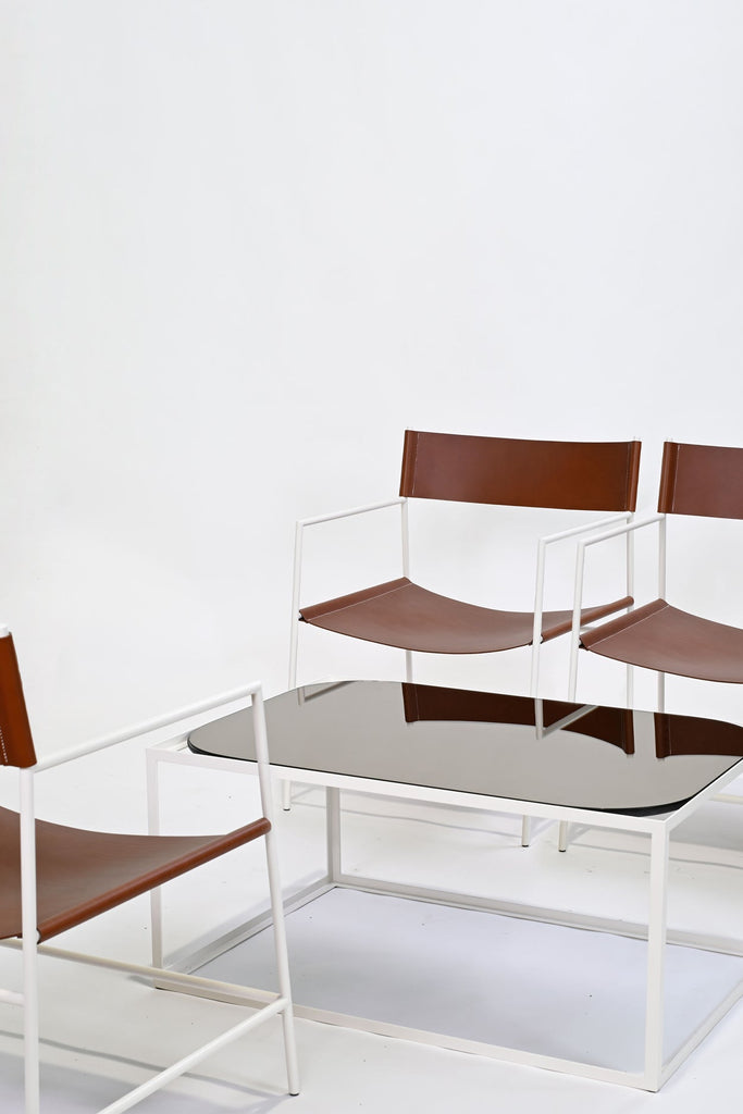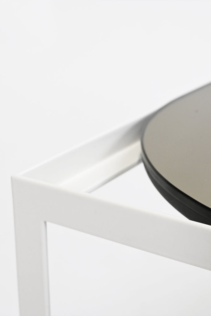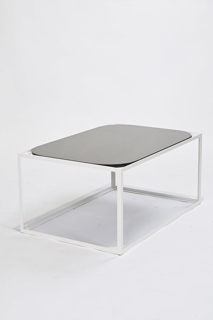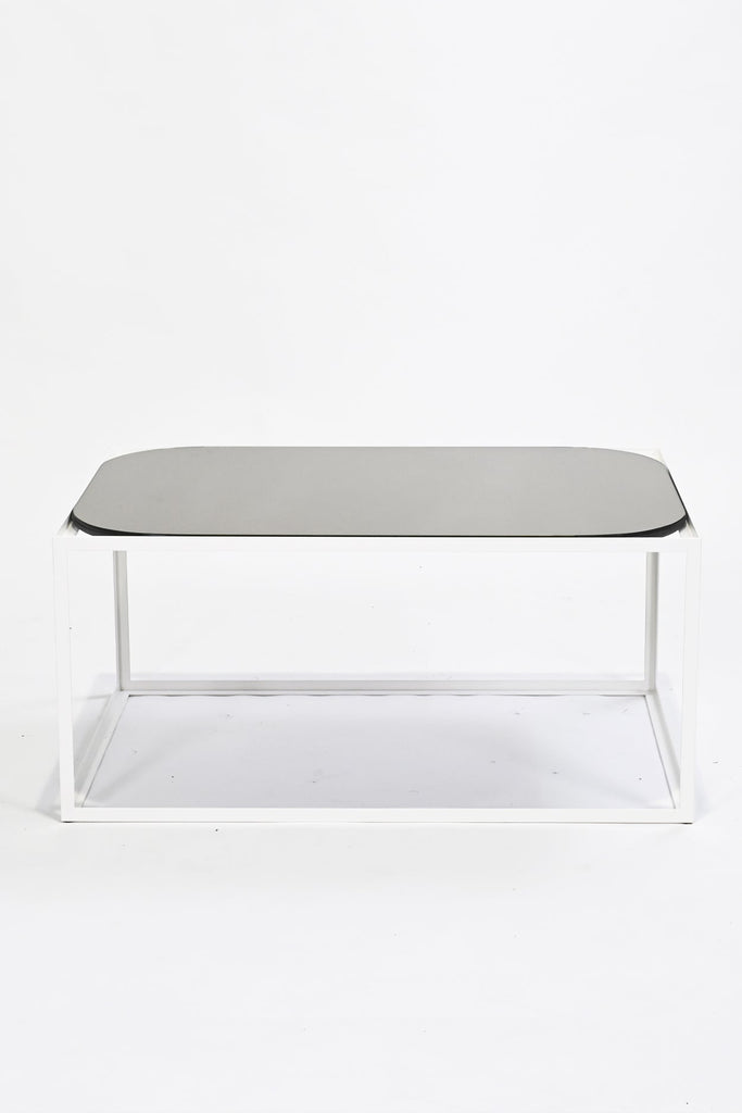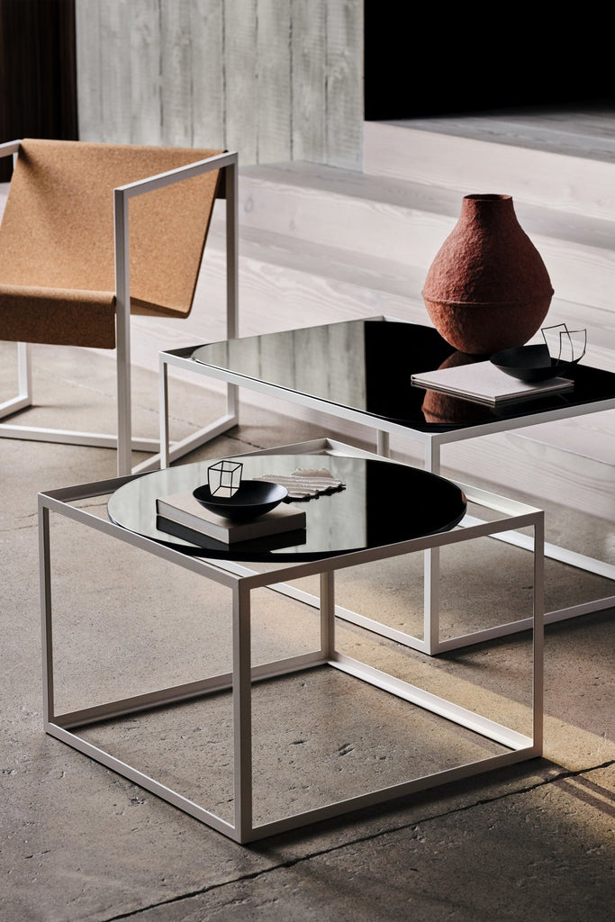 This duo of versatile coffee tables are an exploration of shape and space. The angular metal frames are available in two sizes: square or rectangular. The square table has the option of a square or circular top, whilst the rectangular table has the option of a rectangular top with square or rounded corners. The surface material is available in a slate grey or sepia bronze mirror for a lustrous finish.
